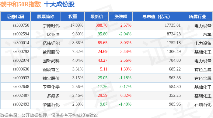 证券之星消息,11月5日,碳中和50R(480021)指数报收于2532.08点,涨2.03%,成交593.53亿元,换手率1.44%。当日该指数成份股中,上涨的有39家,钒钛股份以10.17%的涨幅领涨,下跌的有11家,比亚迪以2.04%的跌幅领跌。