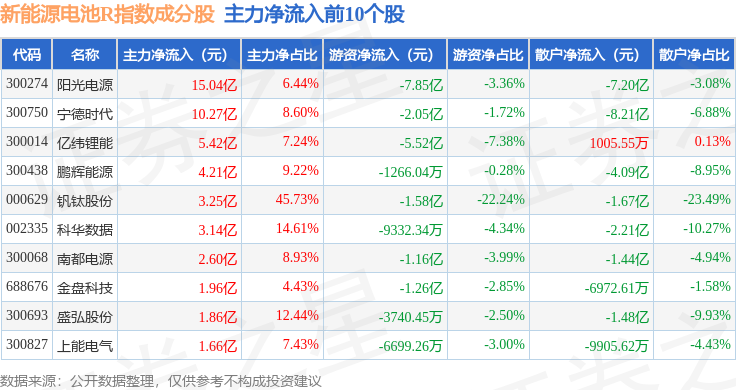 资金流向方面,新能源电池R(480027)指数成份股当日主力资金净流入合计51.14亿元,游资资金净流出合计22.4亿元,散户资金净流出合计28.74亿元。成份股资金流向详情见下表: