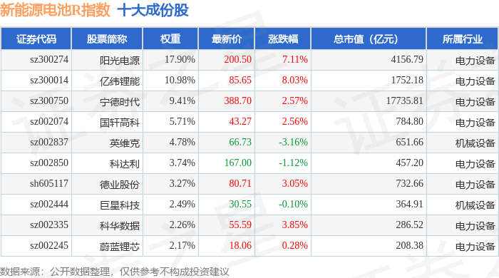 证券之星消息,11月5日,新能源电池R(480027)指数报收于3851.07点,涨4.25%,成交872.55亿元,换手率3.69%。当日该指数成份股中,上涨的有42家,金盘科技以18.12%的涨幅领涨,下跌的有7家,英维克以3.16%的跌幅领跌。