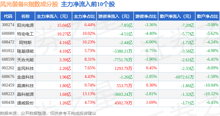 资金流向方面,风光装备R(480026)指数成份股当日主力资金净流入合计43.08亿元,游资资金净流出合计17.17亿元,散户资金净流出合计25.91亿元。成份股资金流向详情见下表: