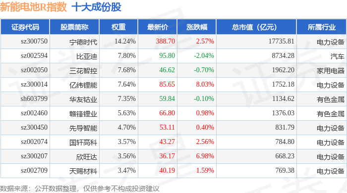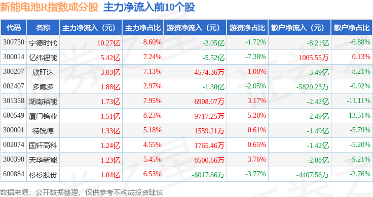资金流向方面,新能电池R(480032)指数成份股当日主力资金净流入合计16.64亿元,游资资金净流出合计2.07亿元,散户资金净流出合计14.58亿元。成份股资金流向详情见下表: