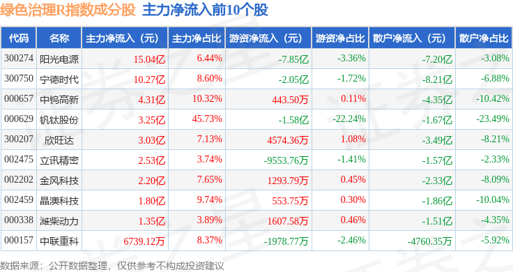 资金流向方面,绿色治理R(480058)指数成份股当日主力资金净流入合计14.23亿元,游资资金净流出合计7.92亿元,散户资金净流出合计6.31亿元。成份股资金流向详情见下表: