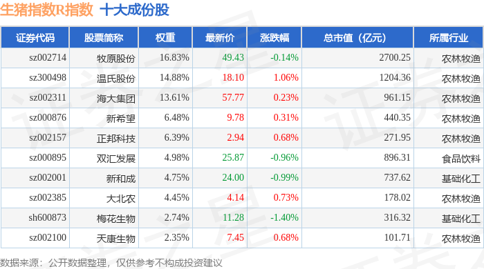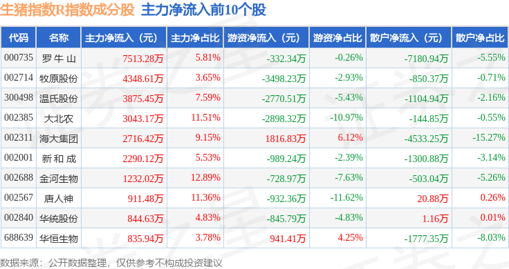 资金流向方面,生猪指数R(480073)指数成份股当日主力资金净流出合计2949.81万元,游资资金净流出合计5538.17万元,散户资金净流入合计8487.98万元。成份股资金流向详情见下表: