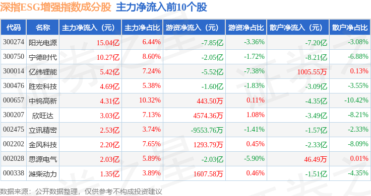 资金流向方面,深指ESG增强(970032)指数成份股当日主力资金净流出合计8.79亿元,游资资金净流出合计3.1亿元,散户资金净流入合计11.89亿元。成份股资金流向详情见下表: