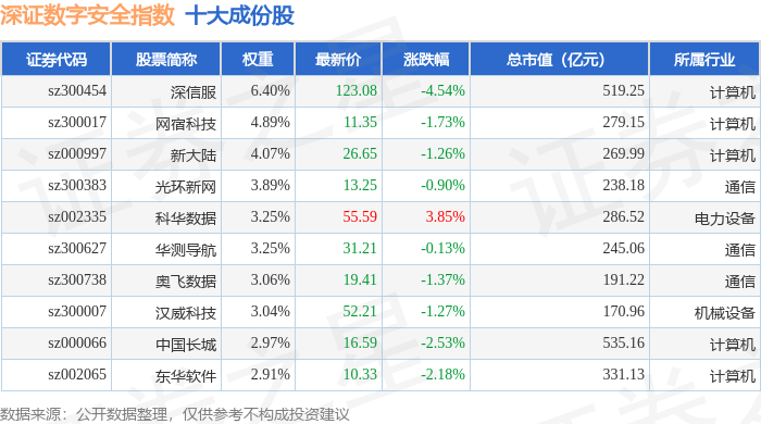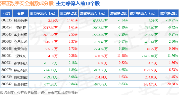 资金流向方面,深证数字安全(970052)指数成份股当日主力资金净流出合计16.12亿元,游资资金净流出合计3.03亿元,散户资金净流入合计19.15亿元。成份股资金流向详情见下表: