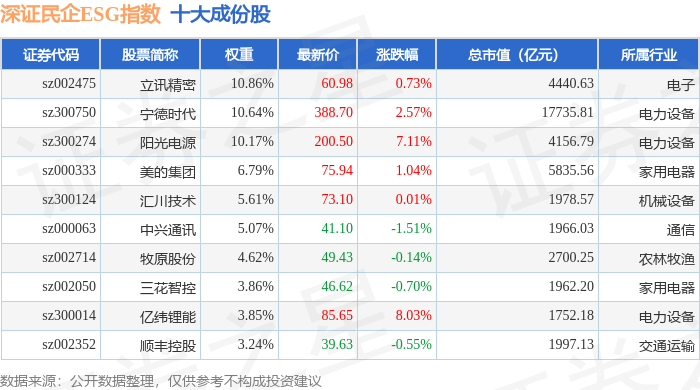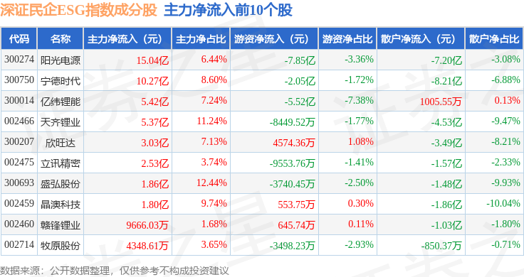 资金流向方面,深证民企ESG(970056)指数成份股当日主力资金净流入合计31.35亿元,游资资金净流出合计14.3亿元,散户资金净流出合计17.05亿元。成份股资金流向详情见下表: