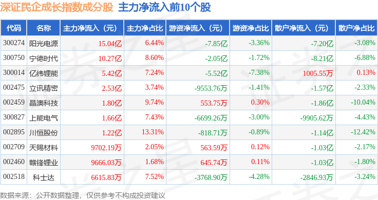 资金流向方面,深证民企成长(970071)指数成份股当日主力资金净流入合计24.38亿元,游资资金净流出合计10.74亿元,散户资金净流出合计13.65亿元。成份股资金流向详情见下表: