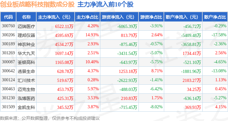 资金流向方面,创业板战略科技(971004)指数成份股当日主力资金净流出合计14.36亿元,游资资金净流入合计4.61亿元,散户资金净流入合计9.75亿元。成份股资金流向详情见下表: