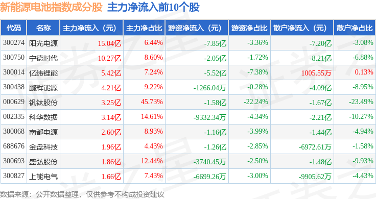 资金流向方面,新能源电池(980027)指数成份股当日主力资金净流入合计51.14亿元,游资资金净流出合计22.4亿元,散户资金净流出合计28.74亿元。成份股资金流向详情见下表: