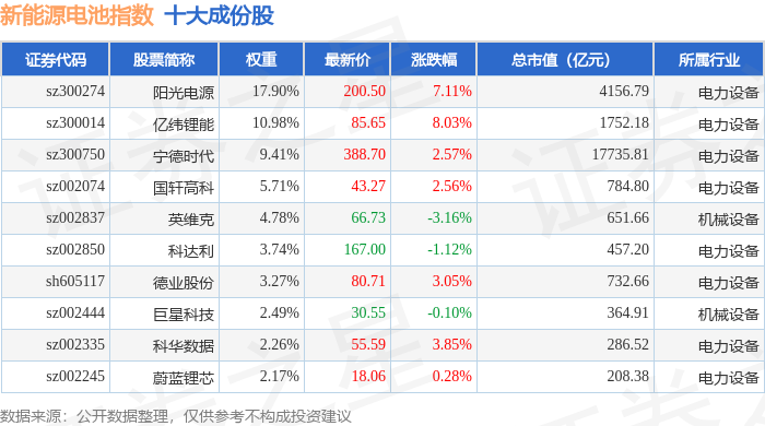 证券之星消息,11月5日,新能源电池(980027)指数报收于3572.87点,涨4.2%,成交872.55亿元,换手率3.69%。当日该指数成份股中,上涨的有42家,金盘科技以18.12%的涨幅领涨,下跌的有7家,英维克以3.16%的跌幅领跌。