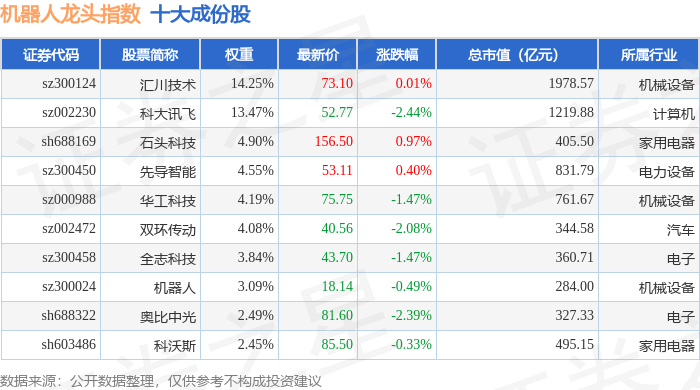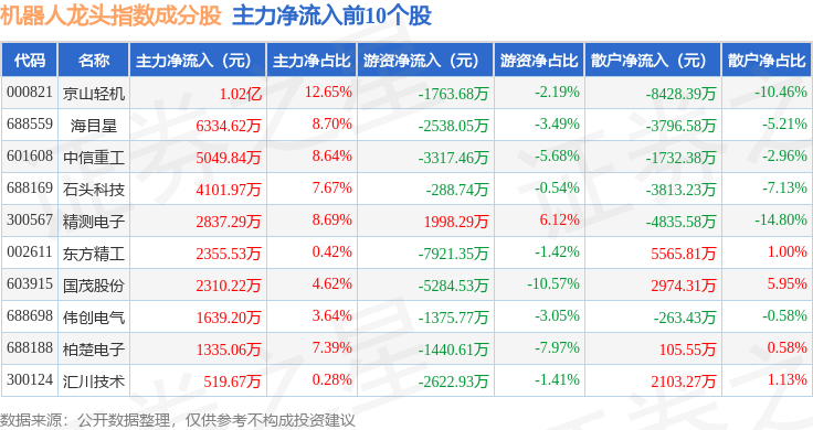 资金流向方面,机器人龙头(980071)指数成份股当日主力资金净流出合计12.68亿元,游资资金净流入合计1.21亿元,散户资金净流入合计11.47亿元。成份股资金流向详情见下表: