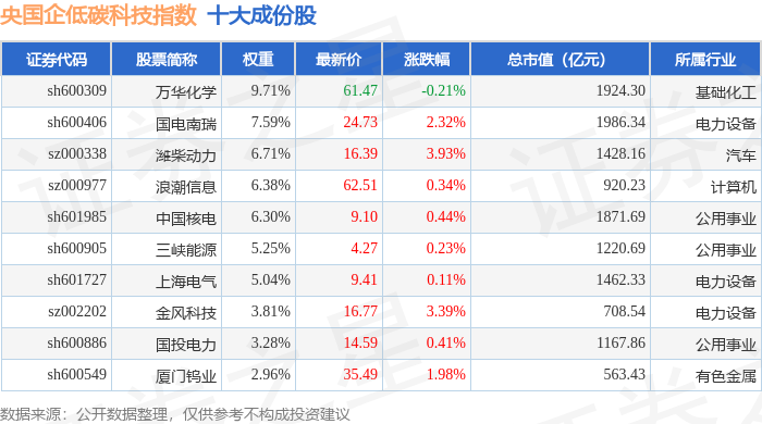 央国企低碳科技(980082)指数十大成份股详情如下: