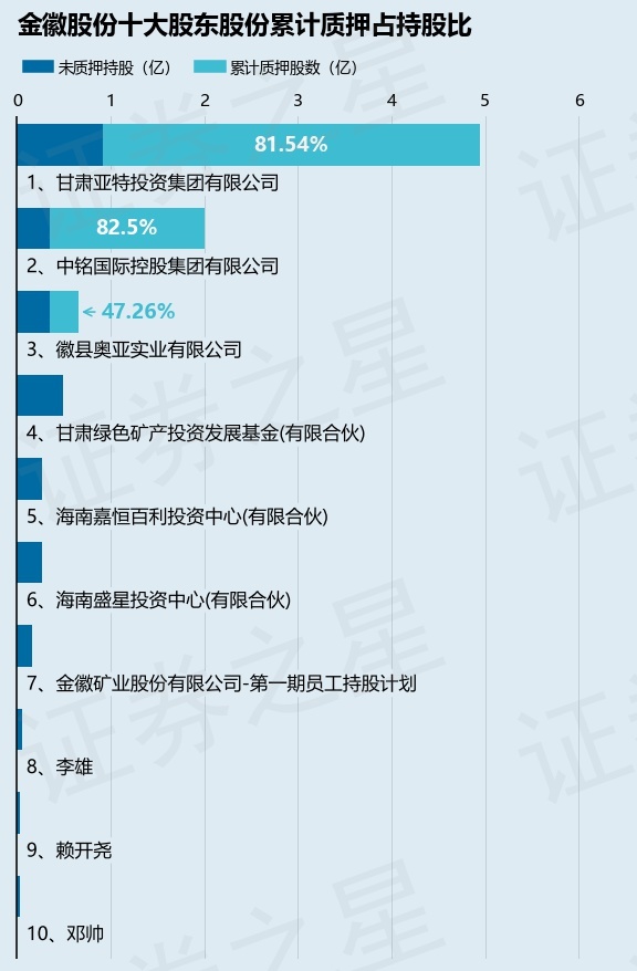 截止本公告日,股东甘肃亚特投资集团有限公司已累计质押股份4.04亿股,占其持股总数的81.54%,股东中铭国际控股集团有限公司已累计质押股份1.65亿股,占其持股总数的82.5%,股东徽县奥亚实业有限公司已累计质押股份3100.0万股,占其持股总数的47.26%。本次质押后金徽股份十大股东的累计质押股份占持股比例(占持股比例的计算以公司最新一期财务报表公布的十大股东的持股总数为基准)见下图: