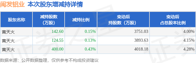 证券之星消息,11月5日闽发铝业发布公告《闽发铝业:简式权益变动报告书》,其股东黄天火于2025年10月14日至2025年11月4日间合计减持667.15万股,占公司目前总股本的0.7108%,变动期间该股股价上涨16.52%,截止11月4日收盘报4.09元。