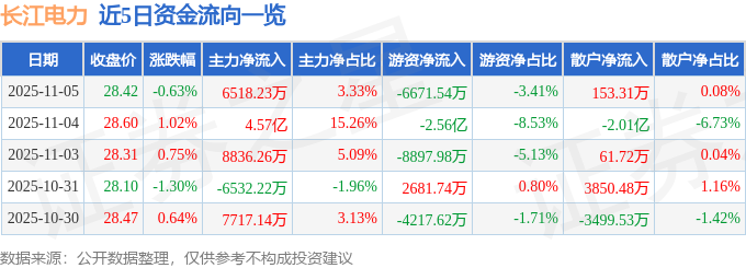 证券之星消息,截至2025年11月5日收盘,长江电力(600900)报收于28.42元,下跌0.63%,换手率0.29%,成交量68.58万手,成交额19.55亿元。