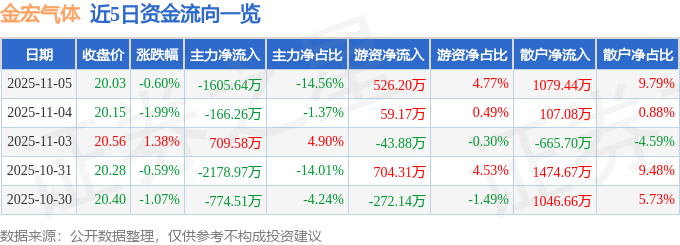 证券之星消息,截至2025年11月5日收盘,金宏气体(688106)报收于20.03元,下跌0.6%,换手率1.15%,成交量5.52万手,成交额1.1亿元。