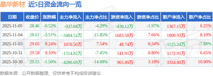 证券之星消息,截至2025年11月5日收盘,晶华新材(603683)报收于28.46元,下跌0.52%,换手率2.93%,成交量7.57万手,成交额2.19亿元。