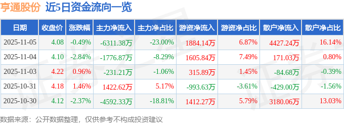 证券之星消息,截至2025年11月5日收盘,亨通股份(600226)报收于4.08元,下跌0.49%,换手率2.29%,成交量68.1万手,成交额2.74亿元。