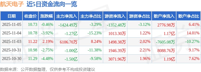 证券之星消息,截至2025年11月5日收盘,航天电子(600879)报收于10.73元,下跌0.46%,换手率1.22%,成交量40.37万手,成交额4.33亿元。