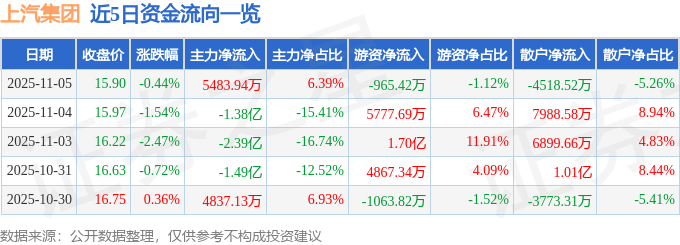 证券之星消息,截至2025年11月5日收盘,上汽集团(600104)报收于15.9元,下跌0.44%,换手率0.47%,成交量54.16万手,成交额8.58亿元。