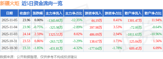 证券之星消息,截至2025年11月5日收盘,新疆火炬(603080)报收于23.96元,上涨0.0%,换手率3.22%,成交量4.55万手,成交额1.09亿元。