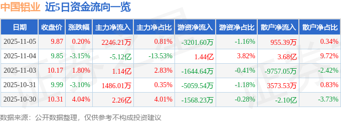 证券之星消息,截至2025年11月5日收盘,中国铝业(601600)报收于9.87元,上涨0.2%,换手率2.18%,成交量286.56万手,成交额27.71亿元。