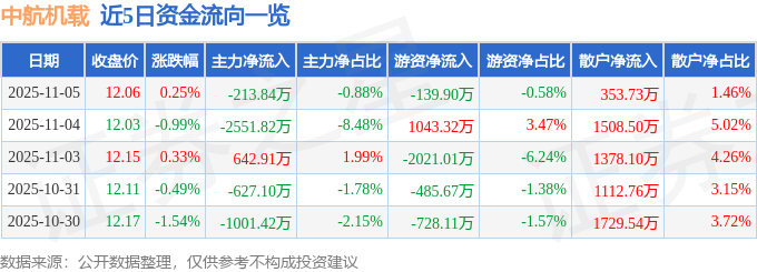 证券之星消息,截至2025年11月5日收盘,中航机载(600372)报收于12.06元,上涨0.25%,换手率0.42%,成交量20.14万手,成交额2.42亿元。