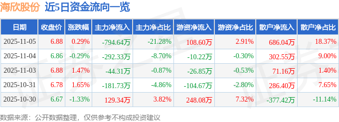 证券之星消息,截至2025年11月5日收盘,海欣股份(600851)报收于6.88元,上涨0.29%,换手率0.74%,成交量5.43万手,成交额3734.86万元。