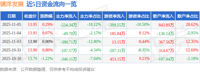 证券之星消息,截至2025年11月5日收盘,镇洋发展(603213)报收于13.95元,上涨0.29%,换手率0.48%,成交量2.12万手,成交额2948.52万元。