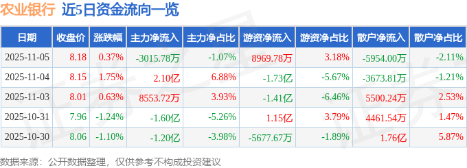 证券之星消息,截至2025年11月5日收盘,农业银行(601288)报收于8.18元,上涨0.37%,换手率0.11%,成交量345.44万手,成交额28.2亿元。
