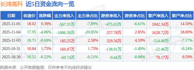 证券之星消息,截至2025年11月5日收盘,长鸿高科(605008)报收于18.02元,上涨0.39%,换手率0.62%,成交量4.01万手,成交额7189.11万元。