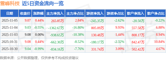 证券之星消息,截至2025年11月5日收盘,雪峰科技(603227)报收于9.07元,上涨0.44%,换手率1.06%,成交量10.36万手,成交额9365.83万元。
