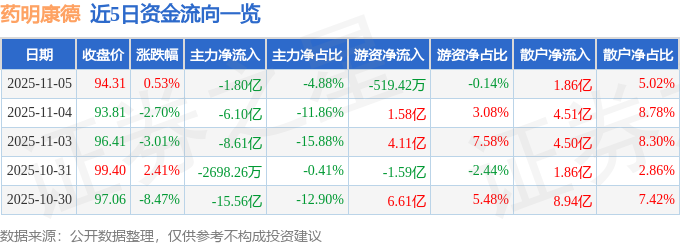 11月5日的资金流向数据方面,主力资金净流出1.8亿元,占总成交额4.88%,游资资金净流出519.42万元,占总成交额0.14%,散户资金净流入1.86亿元,占总成交额5.02%。