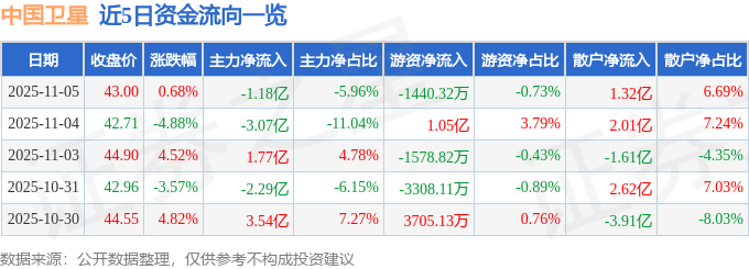 证券之星消息,截至2025年11月5日收盘,中国卫星(600118)报收于43.0元,上涨0.68%,换手率3.89%,成交量46.02万手,成交额19.77亿元。