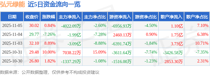 证券之星消息,截至2025年11月5日收盘,弘元绿能(603185)报收于30.02元,上涨0.84%,换手率7.62%,成交量51.71万手,成交额15.47亿元。