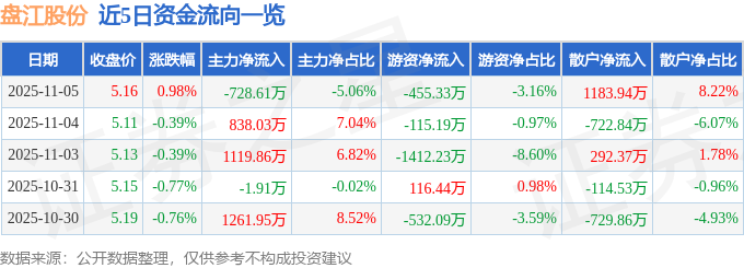 证券之星消息,截至2025年11月5日收盘,盘江股份(600395)报收于5.16元,上涨0.98%,换手率1.3%,成交量27.97万手,成交额1.44亿元。