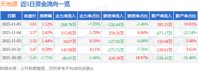 证券之星消息,截至2025年11月5日收盘,天地源(600665)报收于3.61元,上涨1.12%,换手率1.18%,成交量10.2万手,成交额3656.12万元。