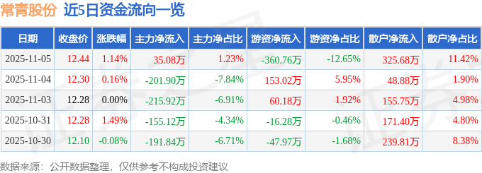 证券之星消息,截至2025年11月5日收盘,常青股份(603768)报收于12.44元,上涨1.14%,换手率0.97%,成交量2.3万手,成交额2851.37万元。