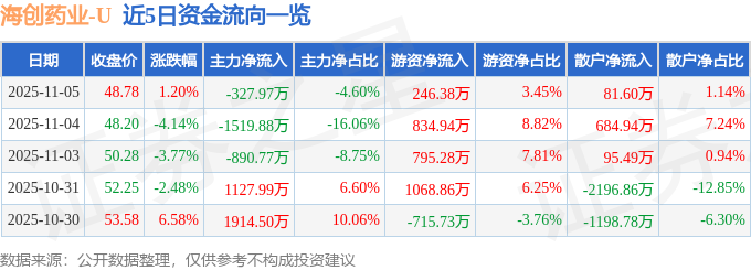 证券之星消息,截至2025年11月5日收盘,海创药业(688302)报收于48.78元,上涨1.2%,换手率1.47%,成交量1.46万手,成交额7132.32万元。
