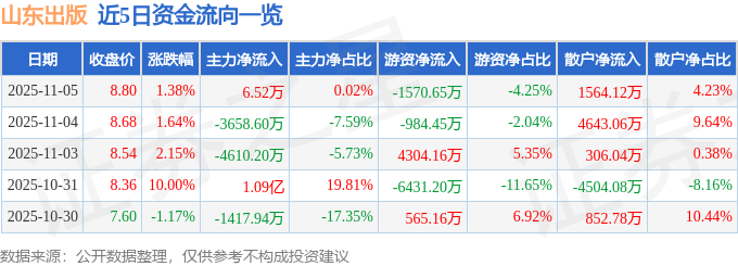 证券之星消息,截至2025年11月5日收盘,山东出版(601019)报收于8.8元,上涨1.38%,换手率2.04%,成交量42.54万手,成交额3.7亿元。