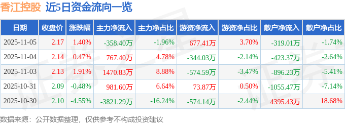 11月5日的资金流向数据方面,主力资金净流出358.4万元,占总成交额1.96%,游资资金净流入677.41万元,占总成交额3.7%,散户资金净流出319.01万元,占总成交额1.74%。