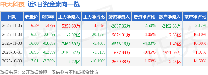 证券之星消息,截至2025年11月5日收盘,中天科技(600522)报收于16.59元,上涨1.47%,换手率2.05%,成交量69.95万手,成交额11.46亿元。