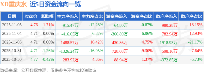 证券之星消息,截至2025年11月5日收盘,XD重庆水(601158)报收于4.76元,上涨1.71%,换手率0.33%,成交量15.77万手,成交额7455.62万元。
