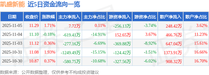 11月5日的资金流向数据方面,主力资金净流入7.72万元,占总成交额0.11%,游资资金净流出256.13万元,占总成交额3.74%,散户资金净流入248.42万元,占总成交额3.62%。