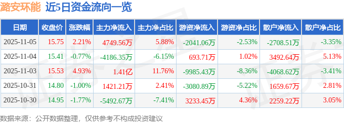证券之星消息,截至2025年11月5日收盘,潞安环能(601699)报收于15.75元,上涨2.21%,换手率1.72%,成交量51.48万手,成交额8.08亿元。