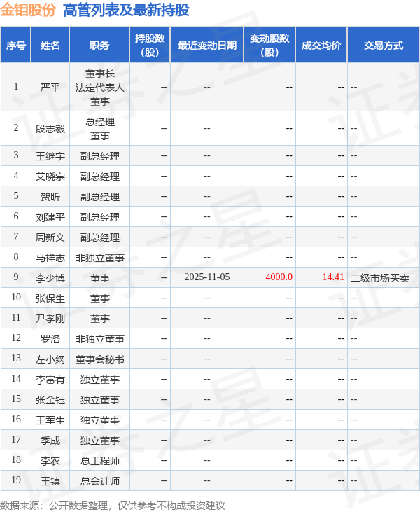 证券之星消息,根据11月5日市场公开信息、上市公司公告及交易所披露数据整理,金钼股份(601958)最新董监高及相关人员股份变动情况:2025年11月5日公司董事李少博共增持公司股份4000.0股,占公司总股本为0.0001%。变动期间公司股价上涨0.91%,11月5日当日收盘报14.41元。