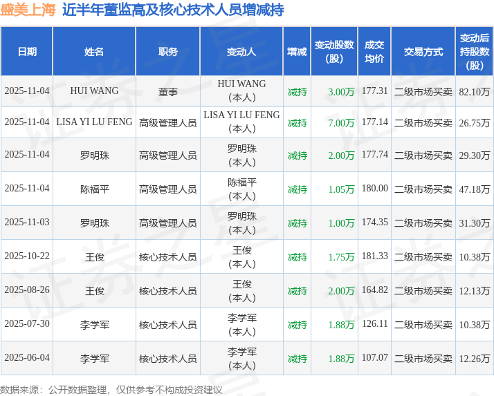 盛美上海近半年内的董监高及核心技术人员增减持详情如下: