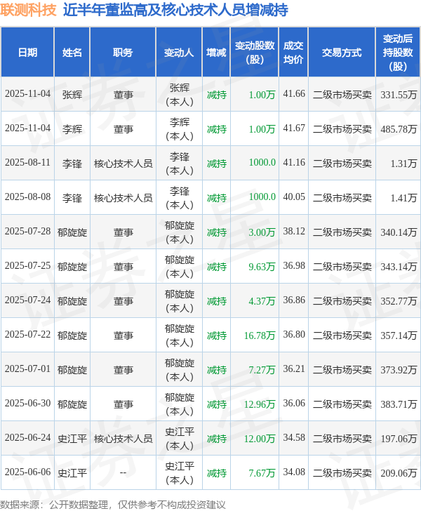 联测科技近半年内的董监高及核心技术人员增减持详情如下: