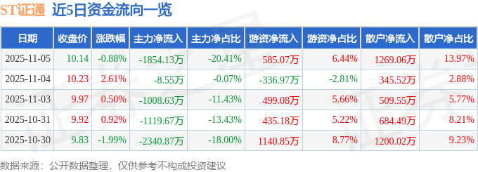 证券之星消息,截至2025年11月5日收盘,ST证通(002197)报收于10.14元,下跌0.88%,换手率1.66%,成交量8.89万手,成交额9086.32万元。