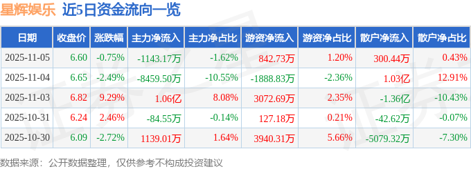 证券之星消息,截至2025年11月5日收盘,星辉娱乐(300043)报收于6.6元,下跌0.75%,换手率8.56%,成交量106.41万手,成交额7.04亿元。
